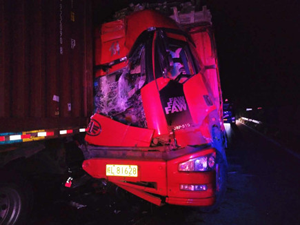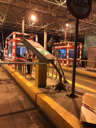 圖為被撞壞的ETC設(shè)備 當(dāng)晚事故接連不斷。晚上22點40分,臺州收費所ETC進口處,一輛大客車行李車門撞歪顯示屏,同時也撞壞了一只抓拍攝像頭,造成了較大的路產(chǎn)損失,但是當(dāng)班員工都正在路面上施救,施救中心領(lǐng)導(dǎo)統(tǒng)籌部署,通知兩位在所非當(dāng)班人員赴崗上班,緊急出動,發(fā)揮連續(xù)作戰(zhàn)精神,進行及時處理。 當(dāng)以上事故處理完畢,施救人員正準(zhǔn)備往回趕的時候,當(dāng)晚23點10分左右,四輛大貨車在寧向1667K+300M處連環(huán)追尾,其中一輛紅色大貨車車頭嚴(yán)重變形并且不斷向外漏油。現(xiàn)場極不安全,情況危急,施救中心員工馬不停蹄,又一次拉響了救援車的警報,為了爭取時間,甚至通知了另外地點待崗的人員火速趕來,以便能及早處理。此時,施救中心當(dāng)班人員已經(jīng)全體出動,全部戰(zhàn)斗在路上。 王凱